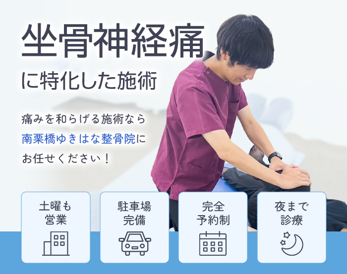 原因についてはさまざまですが、腰椎周辺部位に問題があると考えられます。まず中高年に多く見られるのが腰部脊柱管狭窄症です。脊髄の通り道である脊柱管が狭くなり、神経を圧迫して痛みやしびれといった症状がおきます。腰椎椎間板ヘルニアでも坐骨神経痛の症状がおきます。椎骨の間にある椎間板にはゼリー状の部分がありますが、これが外にはみ出ることで神経を刺激します。若年層でも見られるのが特徴です。